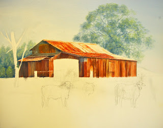 This lesson was all about shadow. The left side of the building was in shadow away from the warm sunlight. We painted in soft purple hues with no hard edges. Remember, shadow can still be colourful and detailed - just keep it soft and muted. I like to mix a Ultramarine Blue with Cadmium Red and add that mix to the colour I want in shade. This helps to grey it off so you don't have bright colours.