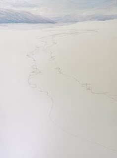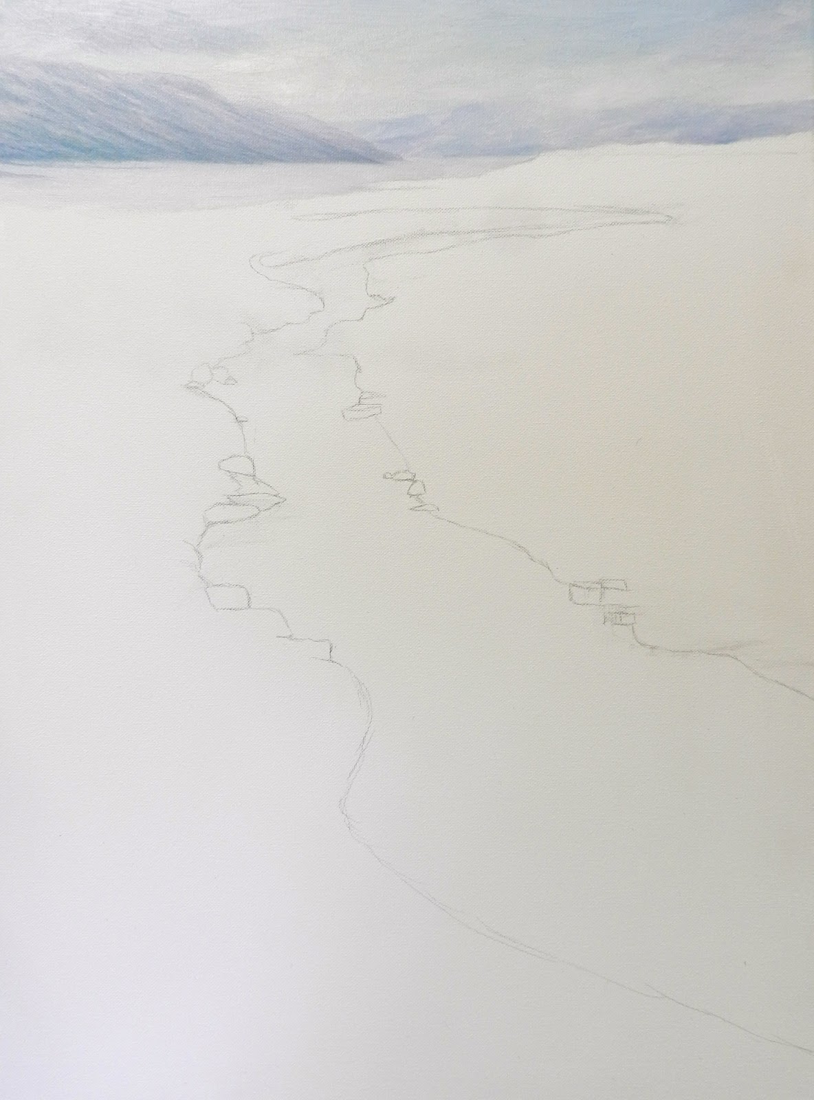Subjects further away lose their intensity of colour, focus and sharp contrasts. Cool colours help to create distance. The sky is darker at the top and fades as it recedes towards the horizon. So with a mix of Cobalt Blue and white, we paint from the top, adding white as we proceed down the canvas. Add wispy clouds with white, feathering off into the wet paint. Clouds are bigger and fluffier at the top and become smaller, closer together and flatter towards the horizon. Give them some shadow underneath with a purpley blue (Cobalt, White and a touch of Permanent Rose).