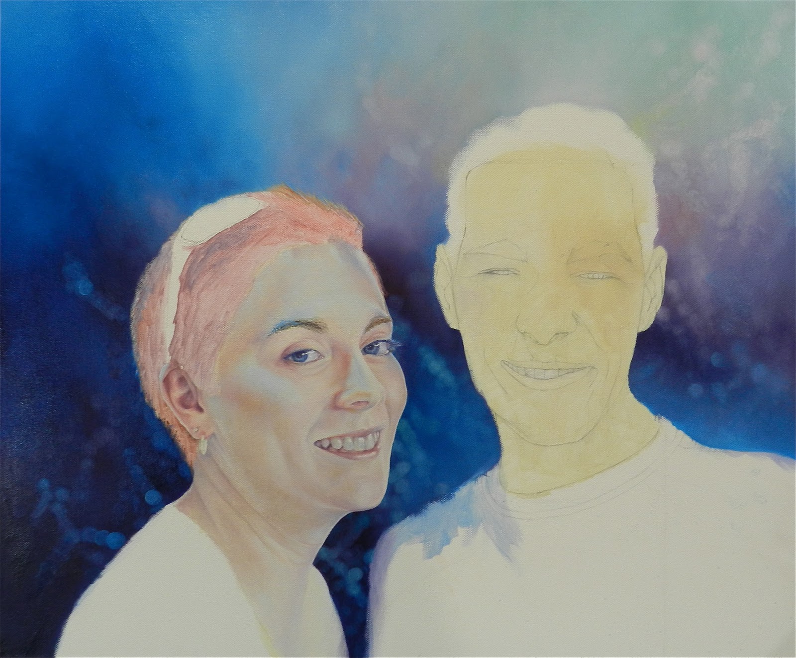I decided to finish my background now as I wanted to smooth off the edge of the face and start the hair. These are best done while the background is wet. I could then decide where to enhance the face with the background colours and start thinking about what colours to do for my daughter's top.