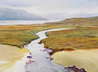Still working our way down I try and mix the same green as a base then add the light greens, darks and oranges on top. You can see in the photo that there is more colour and detail. Where the grass meets the water, it is slightly darker. Create ridges with your dark mix and brush upwards from them with your highlights. Be careful not to paint in neat rows - we need random, haphazard dips and bumps! As we proceed further down, we will use thicker paint for texture, but for now we are still fairly soft and smooth.