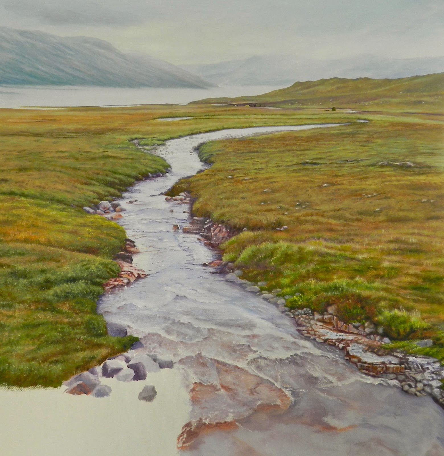 Continuing on with the water - the easiest way to paint this is to divide the water into sections by using the white wash as a guide. The mid-tones can then be blocked in, one section at a time. It is then just a matter of adding darks and highlights according to the various colours of the section that you are painting.