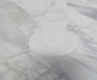 Just filling in the shadows on the tablecloth still. For now, we are keeping the shadows soft so that we can go back into them at a later date. We'll probably work on our tea set next so that we can determine how dark our tablecloth shadows need to be. We are now using Australian Grey to do some of the more creamy highlights in the shadows.