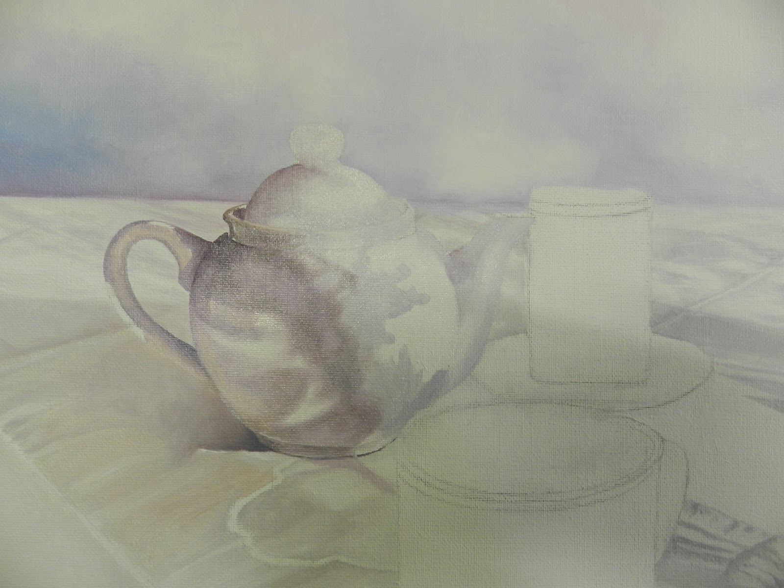 We've finished fiddling around with the tablecloth for now. We need to get rid of the white canvas by filling in the teapot and cups. That way we can go back to our tablecloth and redo some of the shadows accordingly. I started with darks first and dabbed in the shadows, feathering off with white last. I then added some colour, making it a bit more orange to match the tablecloth underneath, and a light blue on the right of the pot to reflect the background.