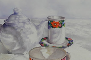 Today, we decided to go back to the teacup at the back and tidy up. I feathered the flowers and shadows off so that they were softer. The shape of the cups and teapot has been the biggest challenge for me. I have been continually correcting the 2 saucer shapes and lip of the cups. Looking at the photo now, I see I still have to get some of my background colour and bring it down into the top of that back cup to lower the edge a bit. I have also redarkened the tablecloth between the teapot and cup to bring the teapot forward.