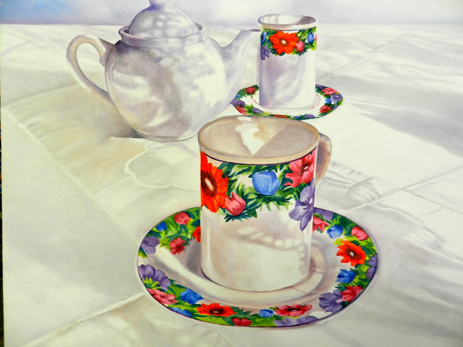 Now we are adding the greens.  We've mixed Cobalt and Lemon together to make a bright green which immediately enhances the whole painting.  I have a dark, medium and a light green mixed on my palette before I start.  Using a No.0 pointed taklon brush I quickly stroke the different tones of greens to give the impression of leaves.  Just make sure the cup at the back is a little more out-of-focus than the teapot in front, so feather off these colours slightly as you go.