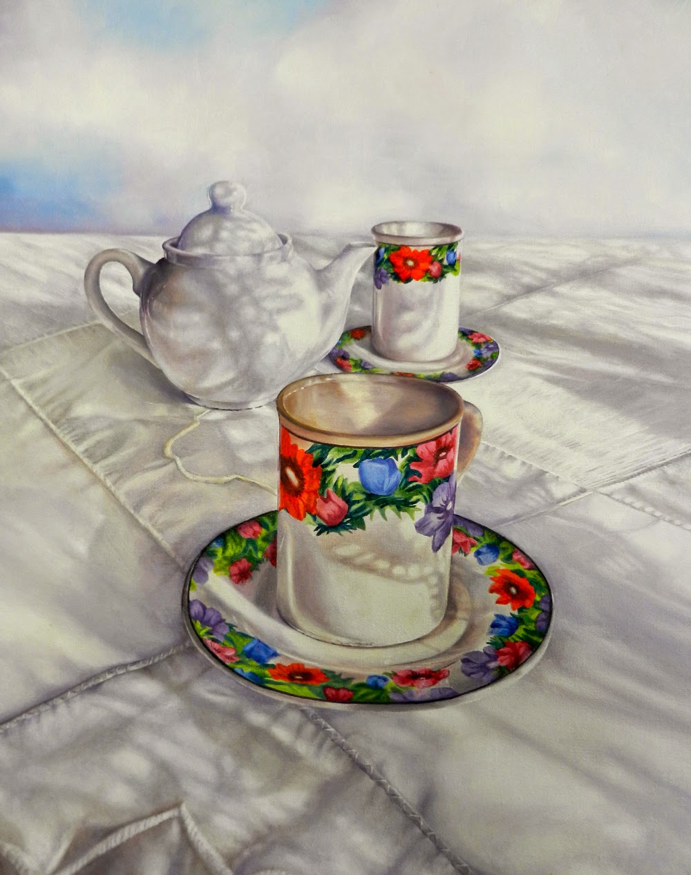 I went over the tablecloth with darker shadows and detailed some of the stitching so that it looks like a tablecloth!  I don't want it too busy, as this will take the focus off the teacups.