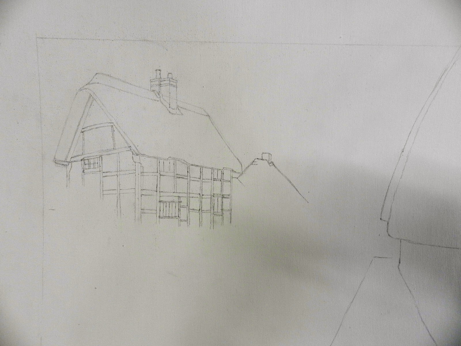 Everyone drew it up at home on a 16x20 inch canvas board. I pencilled in a box in which I wanted the main house to go on the canvas first, as this will be the focal point of our painting.