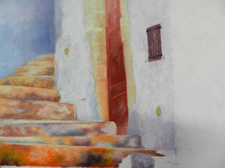 We are just continuing on down the steps, making them a little more detailed, a little more colourful and a little bit sharper! We are also applying the paint thicker as the next lesson will involve using a palette knife, and we don't want the sudden jump from thin paint to impasto.