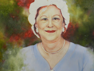 Before moving on to the ears and neck, I have gone back in to the face one last time. I accentuated highlights and darkened shadows and generally just adjusted and fiddled around until I was happy. The ears are slightly pinker in colour and softer as they are behind the face. The edge of the face will be softened later when we do the hair. The neck was done in the same manner. Brush over the dark tones first, then soften them with the highlights before adding any lines or wrinkles. Whilst you have the shadow colours (use the Ultramarine Blue for the shadows as opposed to the Pthalo Green as you want them to be slightly purple in colour) you can brush in the neckline where the blouse sits. Make sure that where the neck sits against the background, it is darker and softer to give the body depth.