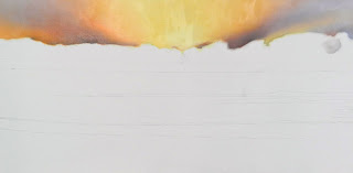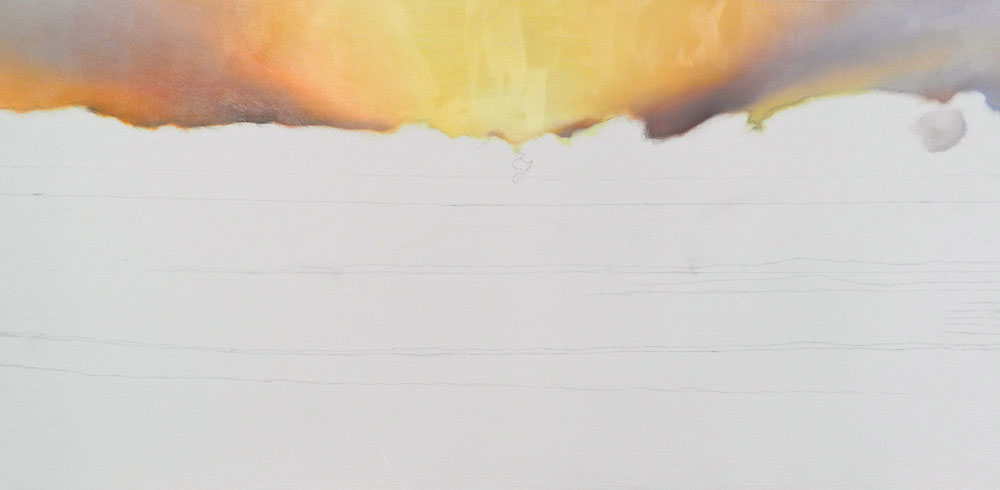 Our biggest challenge with this painting is to be able to feather off the different contrasting colours so as not to make a muddy mess. I started off with a very light Cadmium Yellow Deep in the middle of the sky and gradually oranged it up and darkened it with a Cadmium Red Light. I kept darkening with the red and a dot of the yellow as I went out to the sides. If you keep the oranges red, and the purples red, it will help to blend with the oranges avoiding a green or brown colour. You are then able to come back from the edges towards the centre with a red-purple, very lightly blending in the colours with a very soft brush.