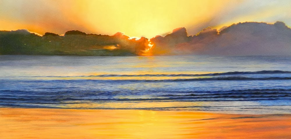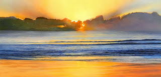 When painting this sunset, keep in mind the tranquility and moody atmosphere that you want to convey.  The waves are small and dark with little detail, which suggests the peaceful scene before you.  Remember also that the light is behind the waves, so it would be hard to see too much detail in the front of the waves anyway.  So, to continue on, I repainted sections of the waves in the Ultramarine Blue and Cadmium Red Light that I have been using so far, and then adding a dot of white to the mix, and using this to suggest some detail in the waves.