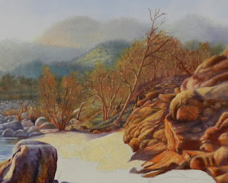 I've decided to work on the right hand side of the painting now where there are trees in the distance and lots of orange rocks. It looks a little daunting at first but if you start from the top and work your way down and forward you can paint it in layers. As objects recede into the distance they lose their intensity in colour, sharpness and tone. So starting from the top, I used Liquin mixed with my premixed muted colours and dabbed in foliage and tree branches, blending them into one another. The Liquin gives a more translucent effect that softens edges. You are also able to go over the same section again with slightly stronger colours and less Liquin. It also dries quickly so you are able to do the final coat with no Liquin. This is where I put in the larger orange trees.