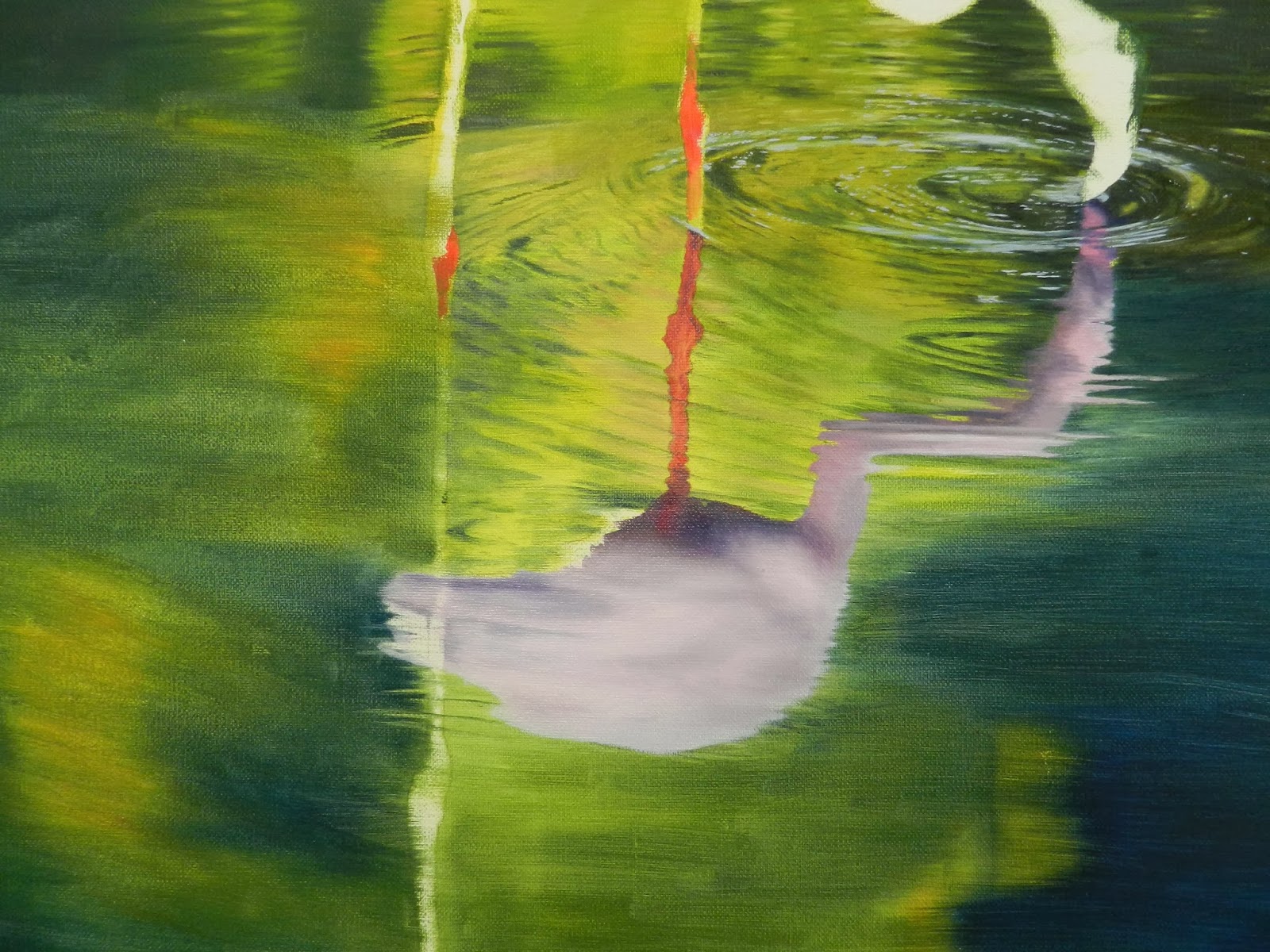 Using the same colours, we painted the flamingo's reflection as if it were in 3D on dry land i.e. forget it is just a reflection for now. Once we have gone thru the procedure of shading, highlighting and detail, I will wipe off my brush and drag it sideways in the direction of the water with my brush on it's side. This will help to blur the tones, and drag out the edges into the greens.