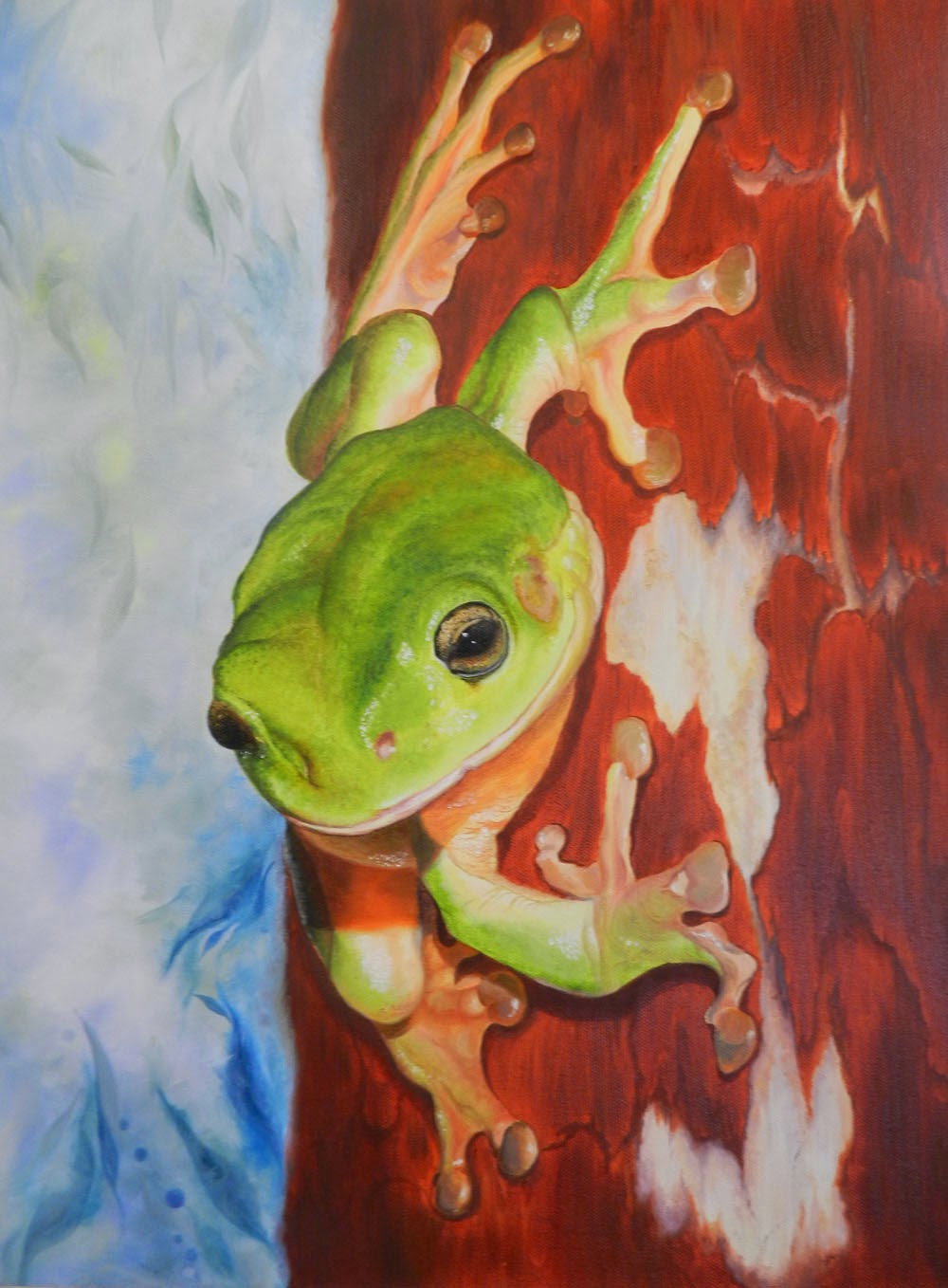 Another of our frog paintings finished. Robbie painted her frog on a large 50x60cm canvas, making it a very impressive, eye-catching piece. It is so realistic that you feel like you could touch it. You can't really see it in the photo, but Robbie has given the frog heaps of texture by dabbing with a round bristle brush.