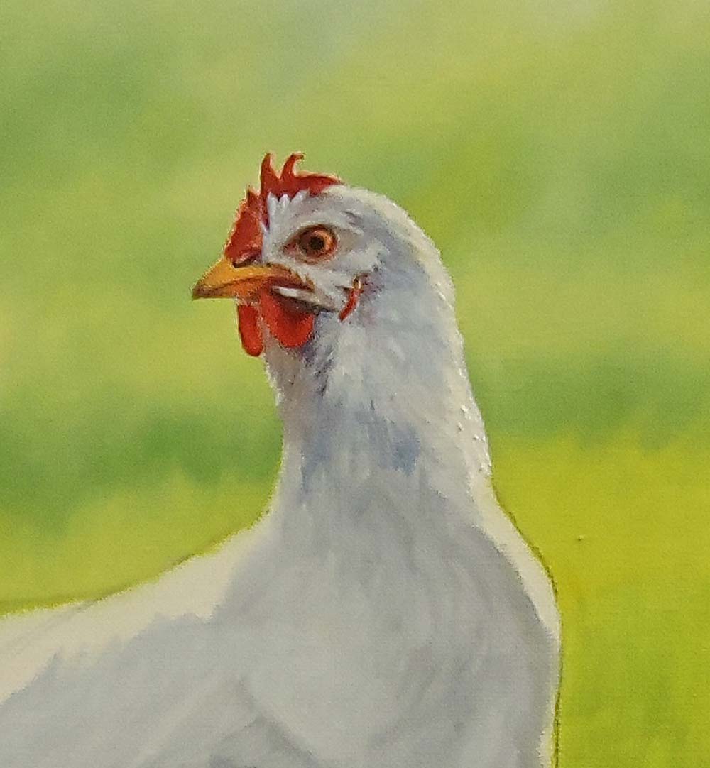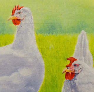 Jo has redefined the chickens' beaks and dabbed some more pink highlights in their combs. When you look closely at the chickens, you don't realise how crazy their combs and wattles etc are until you paint them!