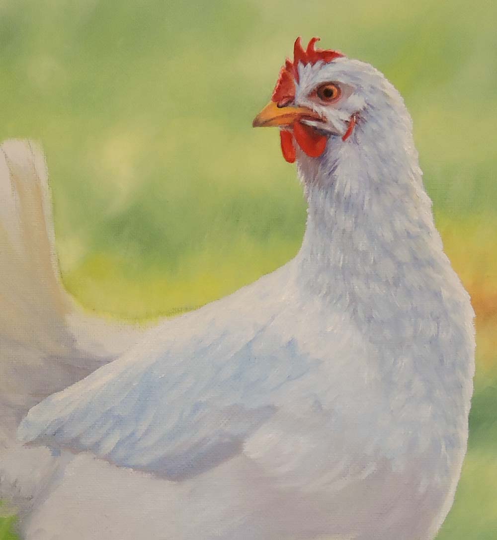 We're back to painting the chickens' feathers today. So working from the head, down the neck and into the wing, I brushed in the darks first (leaving white canvas for the highlights on her front and back). I then dabbed in the feathers with a lighter mix, using a scalloping effect. Lastly, using just white and a fine brush, "feather" off the individual feathers at the top into the darks so that they appear to be coming out from under the top feather. If it starts to become too muddy and wet, leave it for next week and move on.