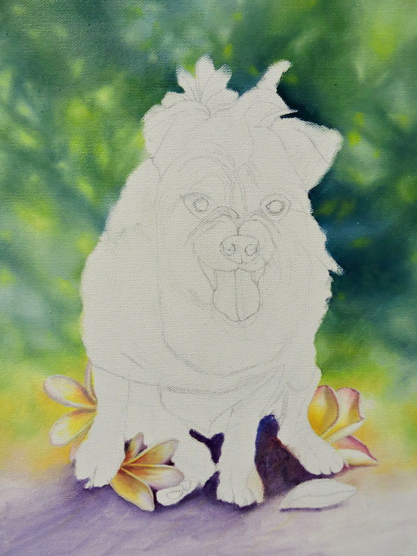 I've started to bring in a bit of interest with a middle foreground of frangipanis. These have a little more structure, yet I have brushed them in so that they do not compete with the focal point and star of the painting - Sophie!