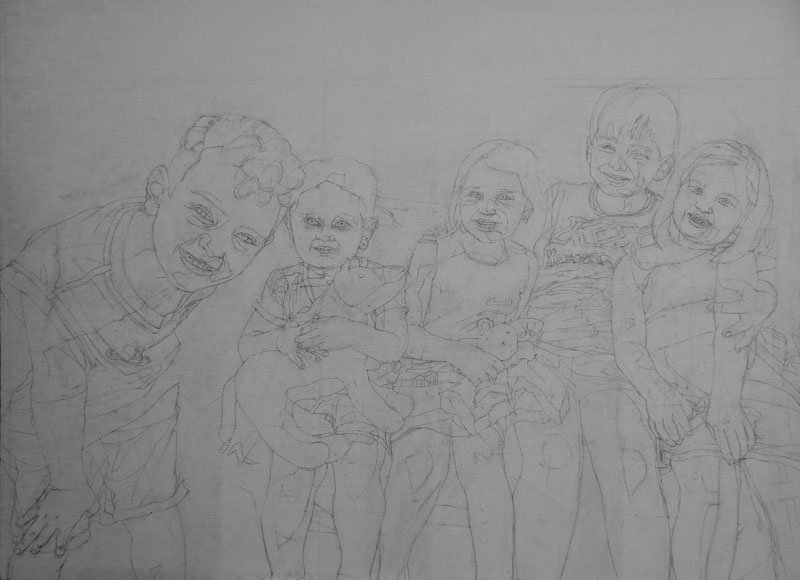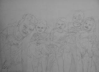 From my little rough sketch on A4 paper, I have finished drawing up my figures on to my big 101x76 cm canvas. This took quite a lot of time - measuring, rubbing out and redrawing the whole way. As I used different parts from different photos, I had to make sure that the sizes of each figure were correct. In the end, it was a matter of what looked visually correct.
