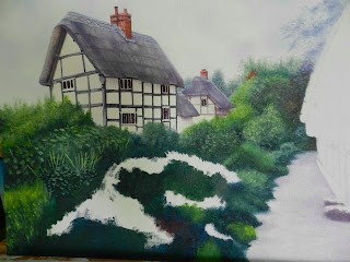 Still painting greens. Make sure the darks are painted first and they can be very dark in the foreground. Flowers will be added later, otherwise you are going to end up with mud. I've introduced Cobalt to the mix. I'm changing my brushstrokes for the variety of plants.