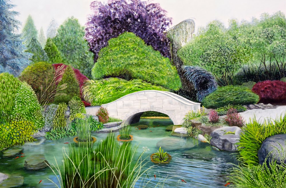 Wow, this is a beautiful painting that Kathy did for her sister-in-law. It's not a small one either - 75x60 cm. There was a lot of work involved and it took a few months to do but well worth the effort. There is plenty of interest in all the different hues of green and shapes of the bushes. The composition is excellent as you are immediately drawn into the painting towards the lovely little bridge. Great job Kathy!