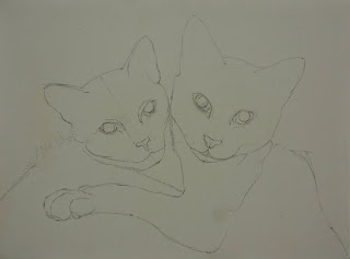 Well, here is our newest challenge! A lovely photo of Grace's two cats having a cuddle in the laundry basket. I find animals the easiest to paint as they don't have to look exactly like the subject (unlike a portrait of someone), they can vary in colour a great deal, and hair can be very forgiving.