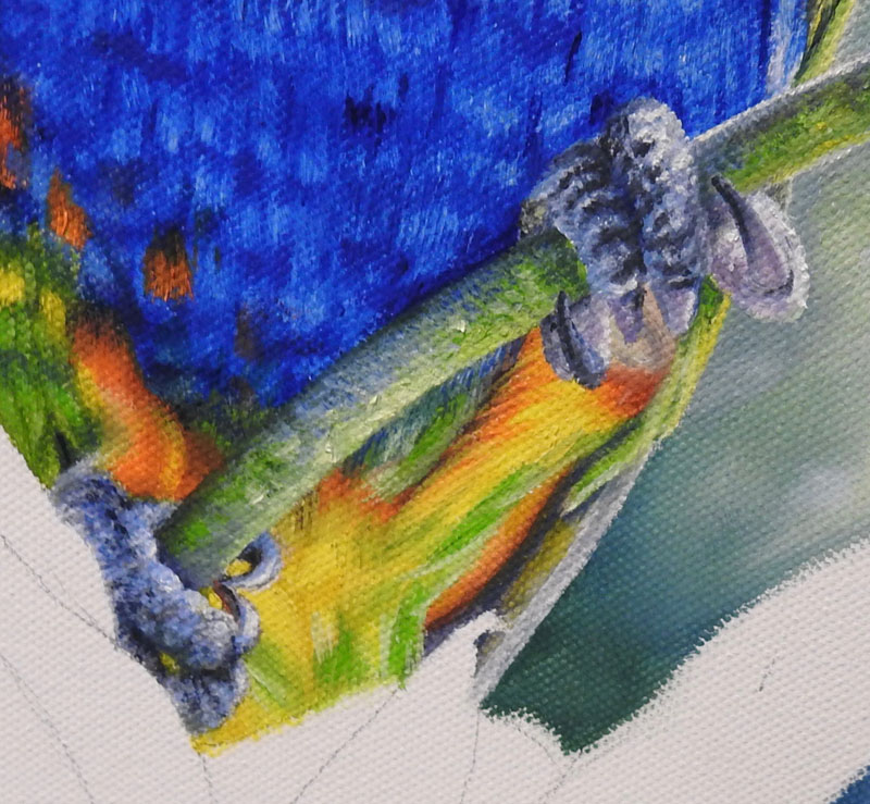 I painted the branch at the same time as the bird's feet so that I could get the contrast of the feet right. The light is very strong on the bird's left, so in order to get that highlight light enough without making it white and therefore losing it's colour, I painted the branch as dark as I could to get that highlight to pop out.