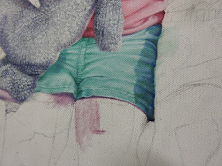 As the creases of the material disappear into the shaded areas, they become darker but also a lot softer. I always start with my shadow mix of Ultramarine Blue and Cadmium Red, adding a bit to the original colour of the material. Don't forget that there is still plenty of light and colour in shadow, only not so bright or sharp as in the highlighted areas. I also like to dab in a little reflective colour (in this case I have dabbed in Cerulean Blue which will be reflecting from Carmen's dress when I paint her next).