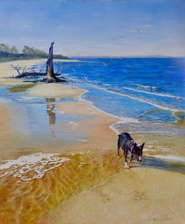 Well this has been a long time in finishing. I've been putting it on the back shelf for a few years now. It started off as a demonstration painting for a new student and when she left, I never went back to finish it off but here it is. Shiraz just loves the beach although hates getting wet! This painting is a keeper as it brings back fond memories for me.
